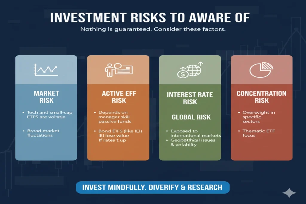 - Market Risk: Tech and small-cap ETFs are volatile.